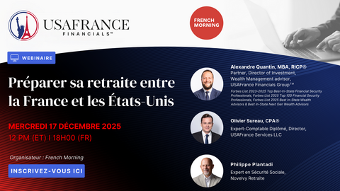 Nous vous proposons un webinaire dédié au calcul de la retraite franco-américaine. Trois experts aborderont les sujets suivants: – Règles de calcul des retraites françaises et américaines – Réforme des retraites en France : quel impact sur une carrière internationale ? – Fiscalité des retraites et intérêt de la convention de sécurité sociale – Les stratégies patrimoniales de retraite aux États-Unis Nos experts: – Alexandre Quantin. Alexandre est Partner et Wealth Management Advisor chez USAFrance Financials Group™️. Avec plus de 10 ans d’expérience en gestion patrimoniale pour les Français aux États-Unis, Alexandre fait partie de la liste Forbes des meilleurs professionnels de la finance en 2023, 2024 et 2025. – Olivier Sureau, CPA® – Expert-Comptable Diplômé, Director, USAFrance Services LLC – Philippe Plantadi, en charge du développement sur les continents américain et européen chez Novelvy Retraite, cabinet privé qui accompagne ses clients dans la connaissance et la perception de leurs droits de retraites en France et à l’étranger. Vous aurez l'occasion de leur poser vos questions en direct pendant le webinaire. Vous pouvez également nous les envoyer en amont du webinaire, à : rpoirot@frenchmorning.com |