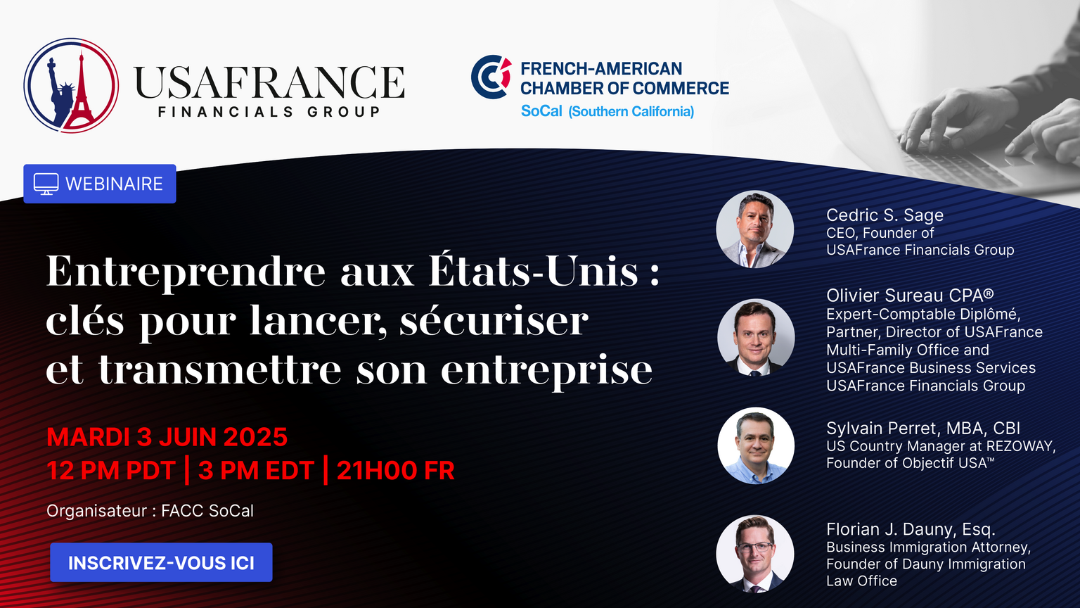 Rejoignez USAFrance Financials Group, en collaboration avec FACC SoCal, pour un webinaire-table ronde sur les étapes clés de l’entrepreneuriat franco-américain — de l’implantation à la revente.