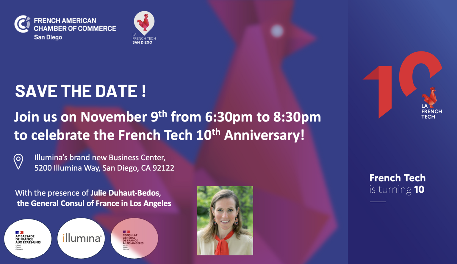 We are thrilled to announce our future and exciting event — the 10th birthday celebration of La French Tech! This event will be held on November 9th from 6:30pm to 8:30pm PT at Illumina's new Business Center, here in San Diego.