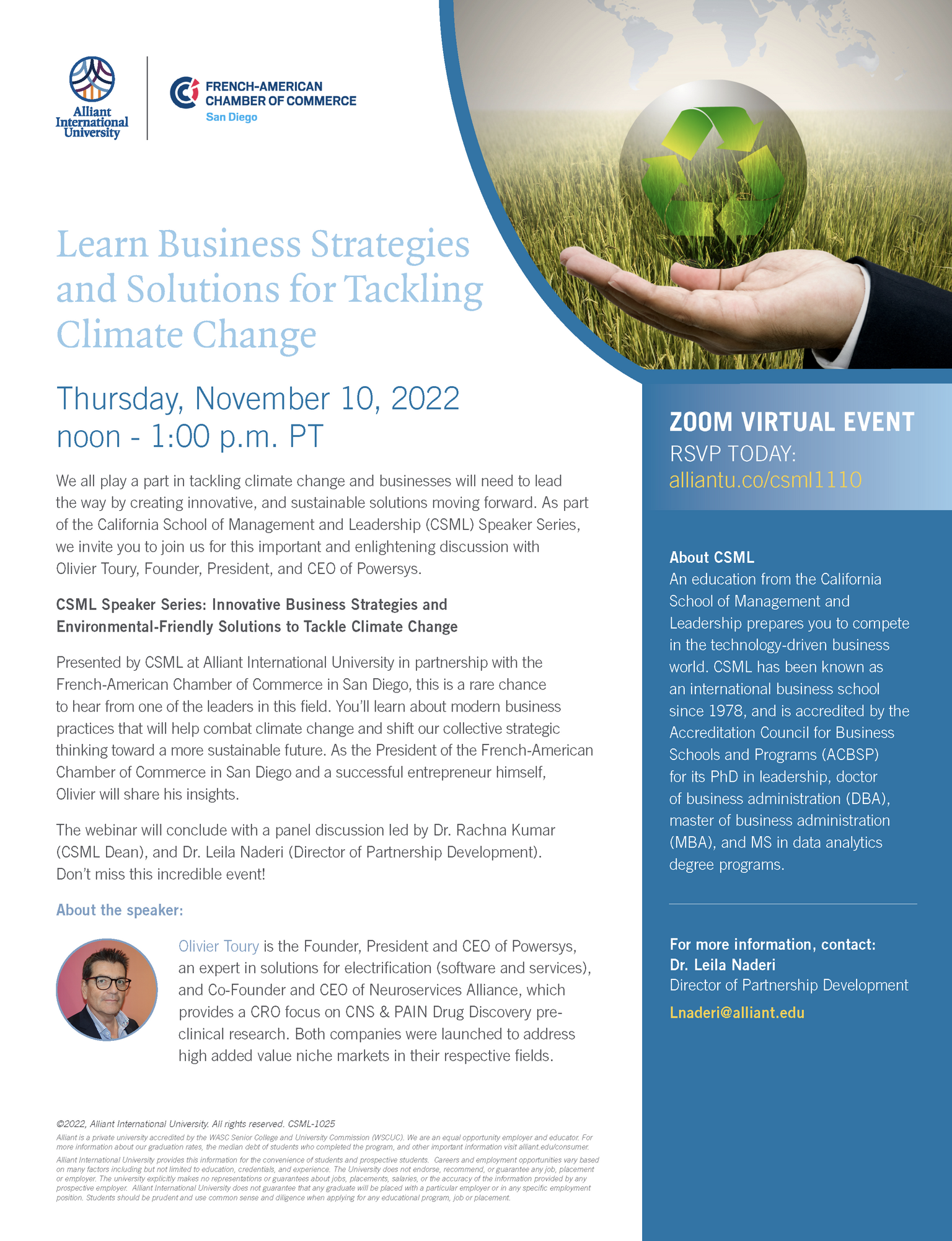 Presented by CSML at Alliant International University in partnership with the French-American Chamber of Commerce in San Diego, this is a rare chance to hear from one of the leaders in this field. You'll learn about modern business practices that will help combat climate change and shift our collective strategic thinking toward a more sustainable future. As the President of the French-American Chamber of Commerce in San Diego and a successful entrepreneur himself, Olivier will share his insights.