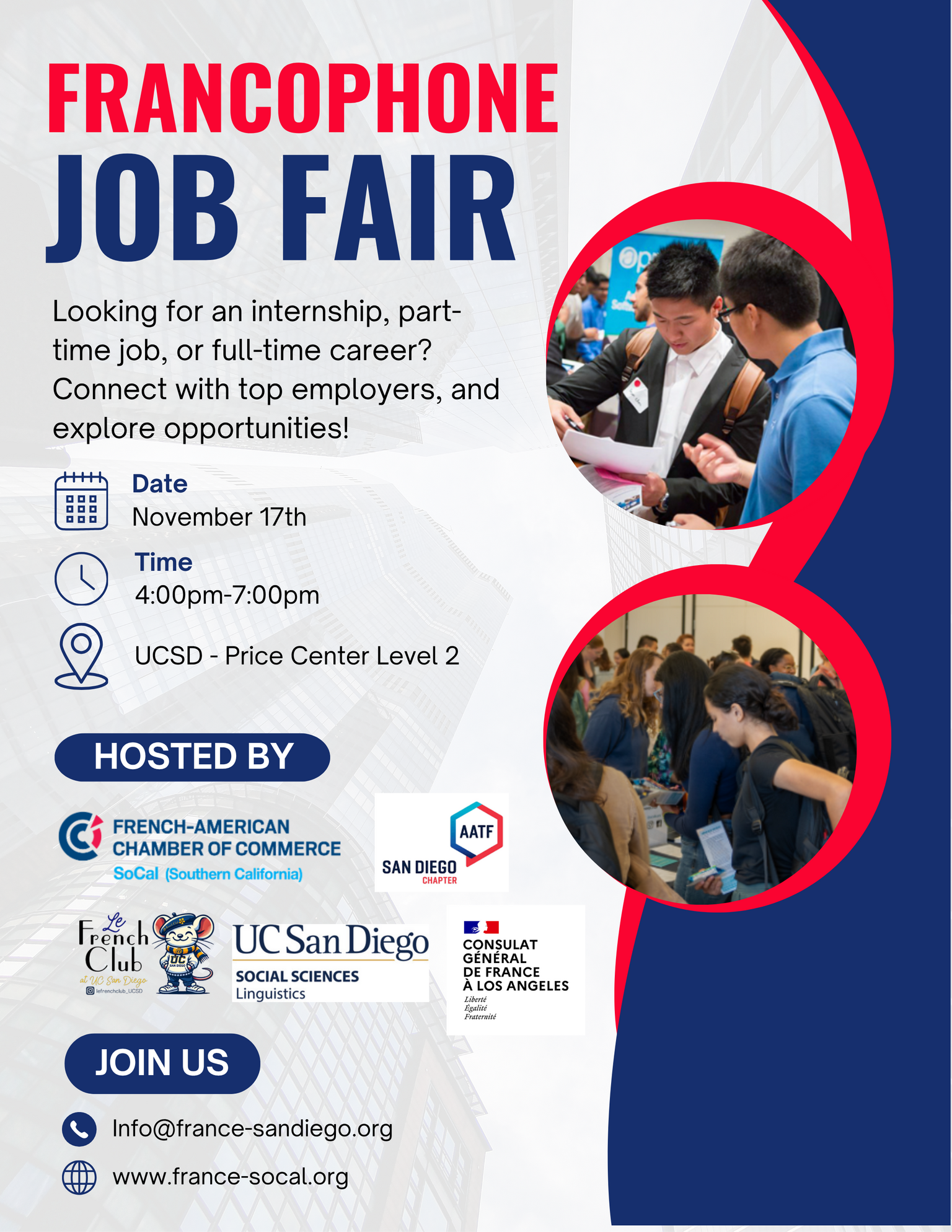 Join us on November 17th from 4:00 PM to 7:00 PM at UCSD for the French Job Fair, an exciting opportunity to connect with top employers